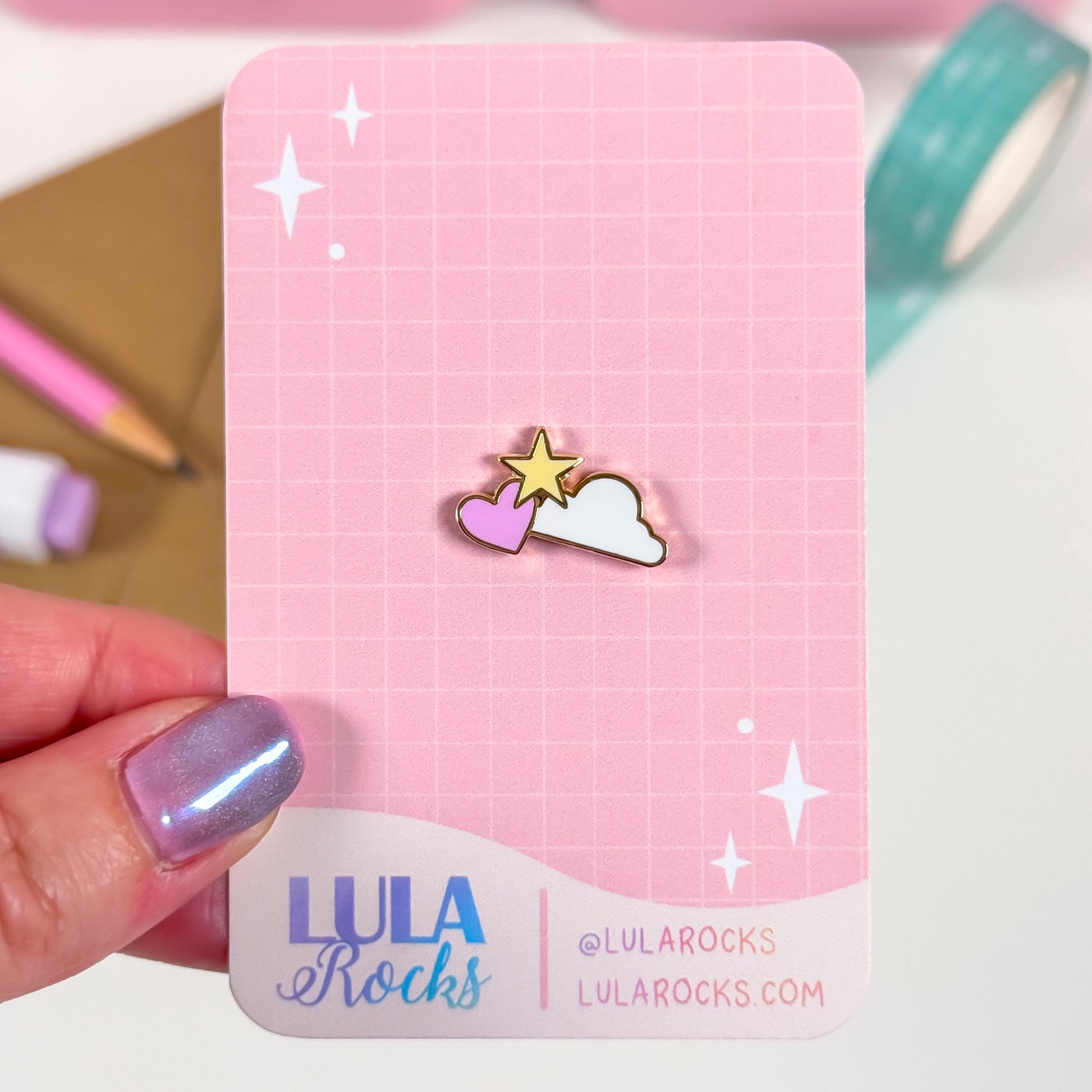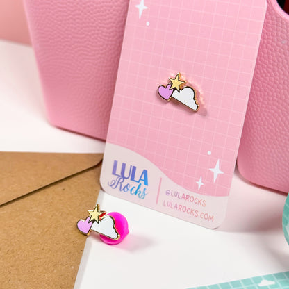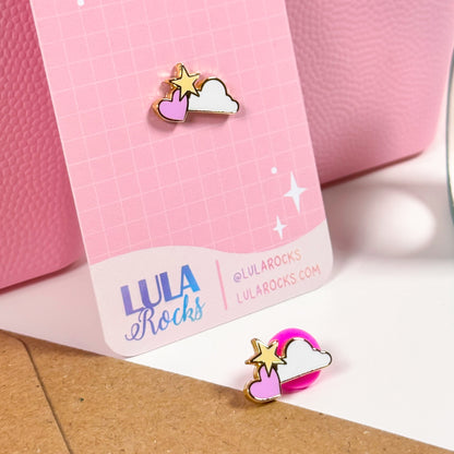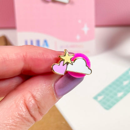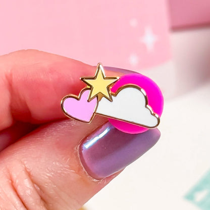 Cute, colourful, and full of charm - the Cloudburst mini enamel pin is a tiny mix of heart, star, cloud, and magic. Measuring just 18mm across, this gold-plated hard enamel pin combines soft pastel tones with a whimsical design that’s perfect for dreamy pin lovers.