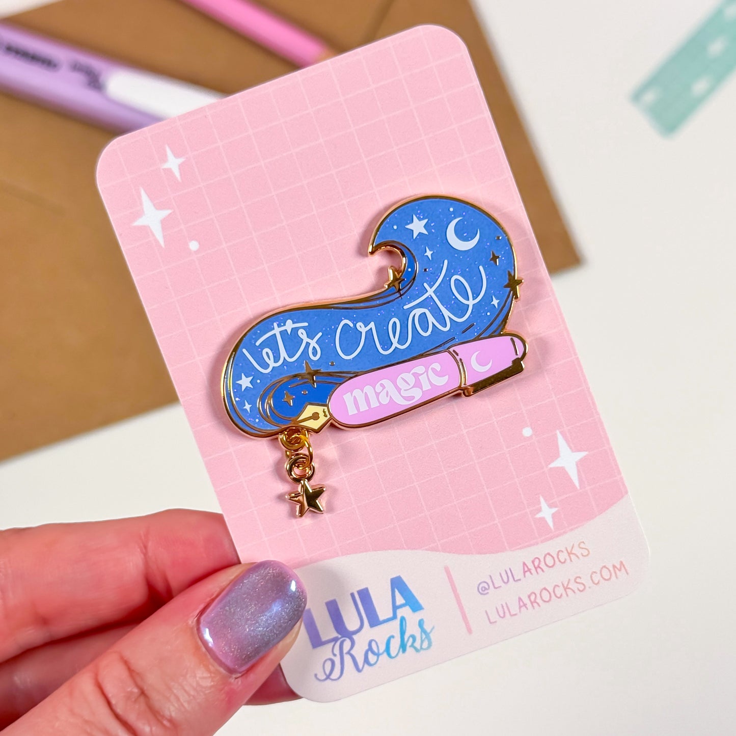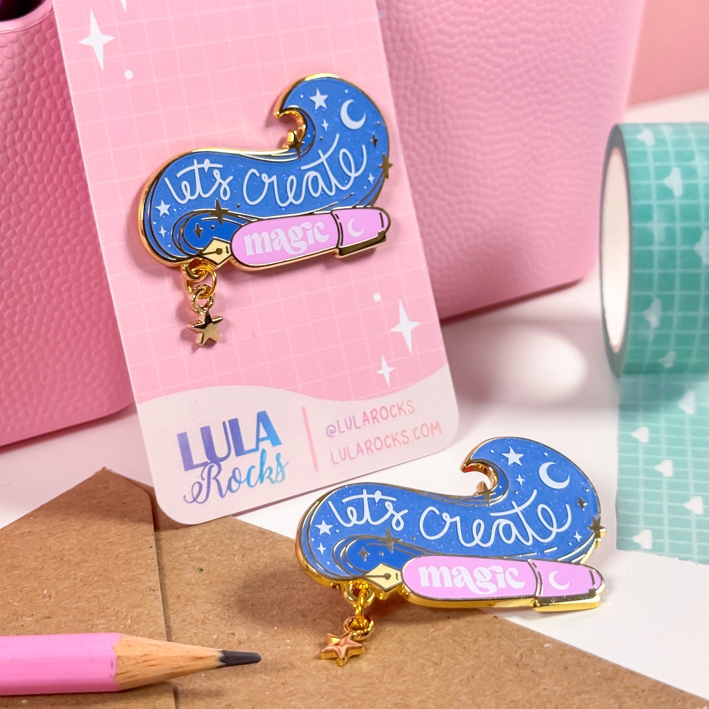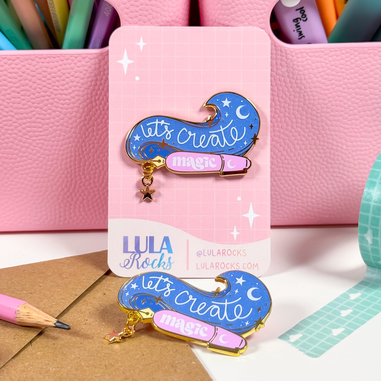 Finished with glitter details for extra sparkle and a gold star dangle charm that moves as you wear it, this pin is a standout piece for any jacket, lanyard, backpack or pin board. It comes with pink rubber clutches, the Lula Rocks logo stamped on the back, and plenty of charm for anyone who loves magical stationery.