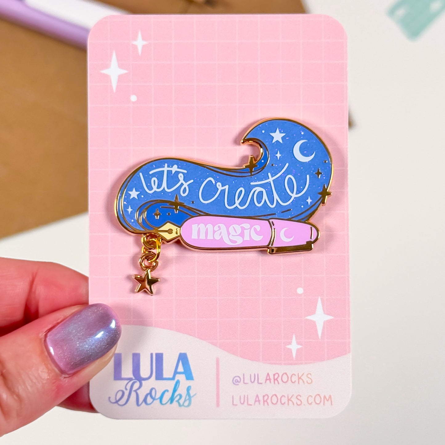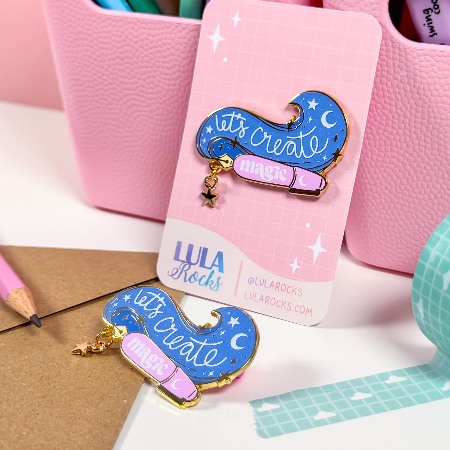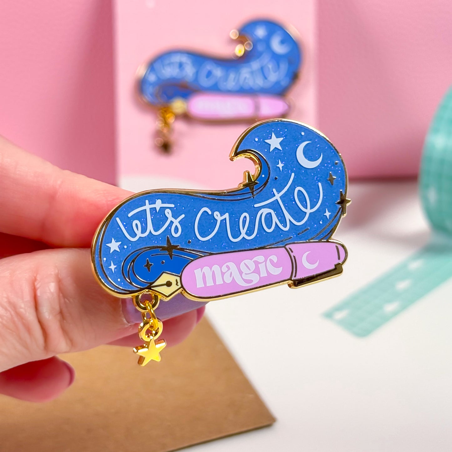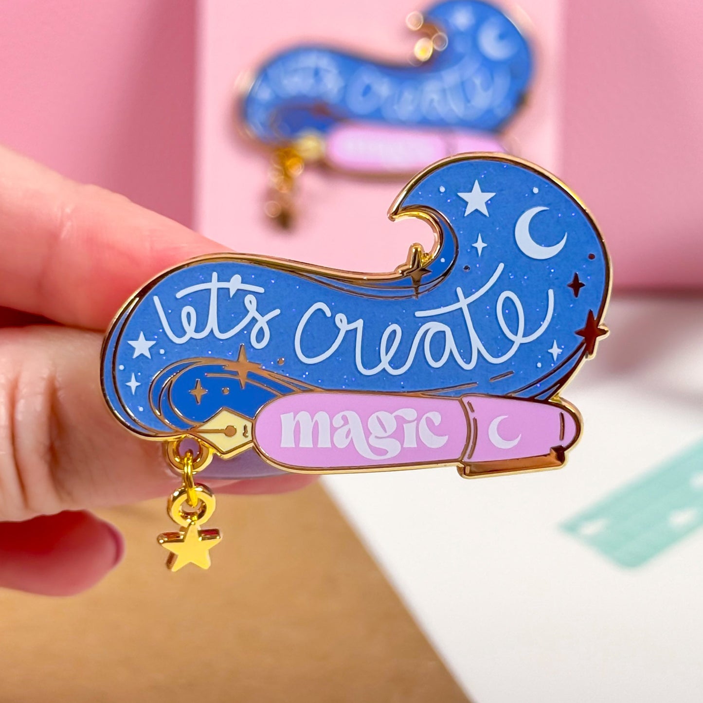 Add a spark of creativity to your pin collection with the Let’s Create Magic enamel pin - a whimsical design for stationery lovers, doodlers, and magical minds. This 45mm gold-plated hard enamel pin features a bold blue night sky filled with stars and moons, a pastel pink fountain pen, and the phrase “let’s create magic” in delicate screen-printed lettering.