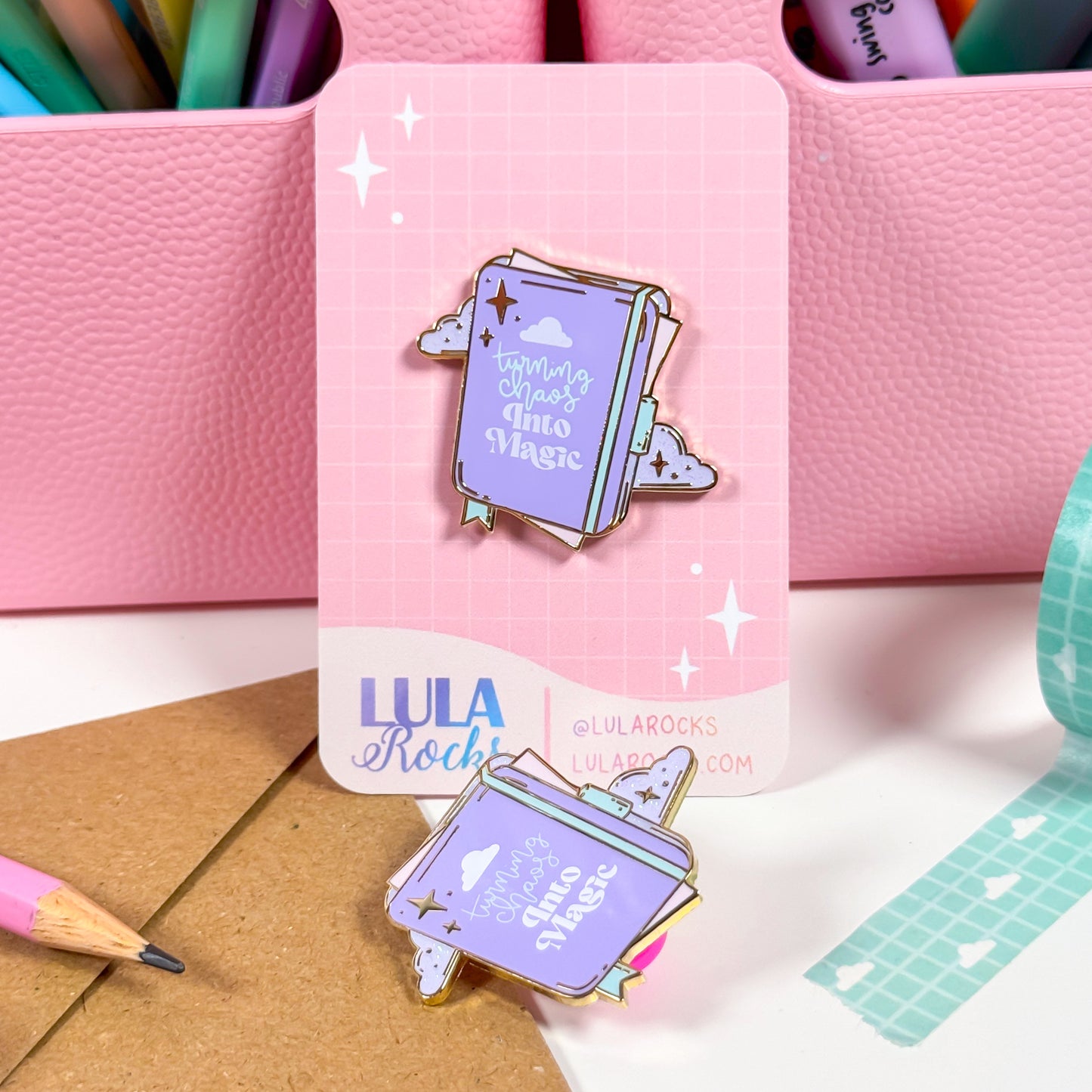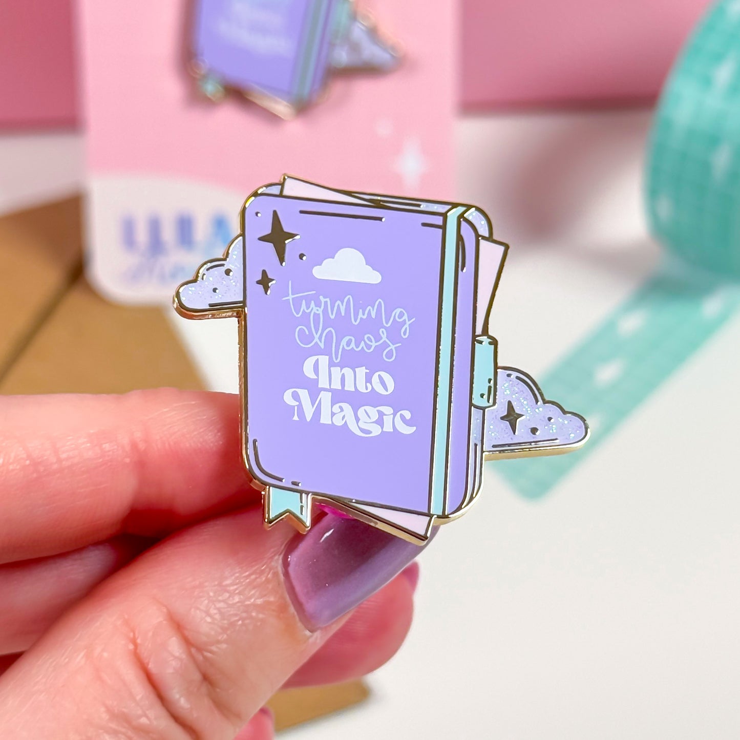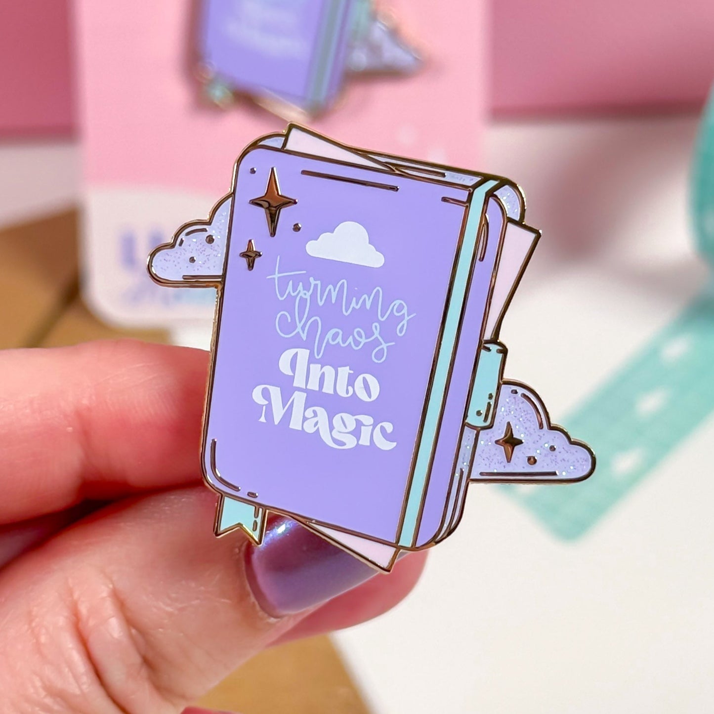 A gentle reminder for creative souls everywhere - the Turning Chaos Into Magic enamel pin captures the beauty of messy minds and magical outcomes. This 35mm hard enamel pin features a pastel purple journal floating among sparkling clouds, with silver glitter details and delicate screen-printed lettering.
